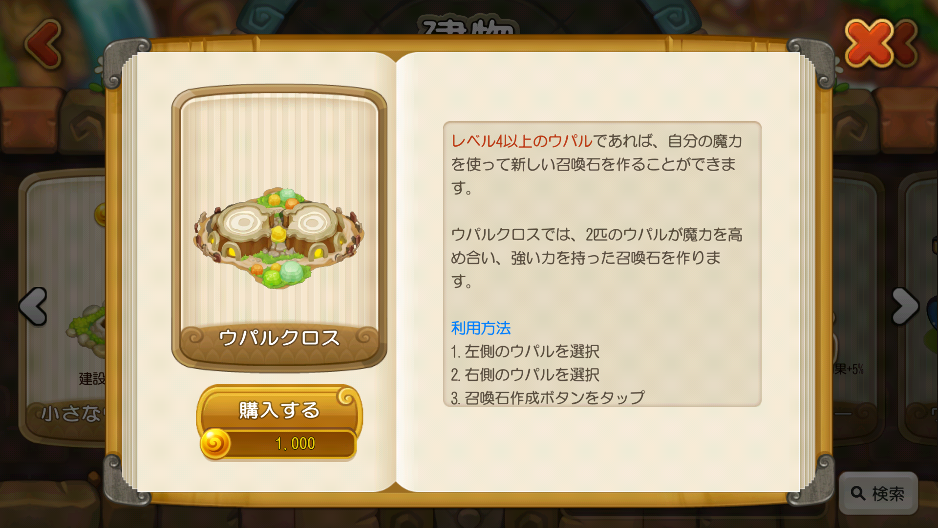 • 入手した召喚石を使い「召喚石の祭壇」でウパルを呼び出します。ウパルによって呼び出せるまでの時間が違います。祭壇を追加することで、最大4つ同時に召喚作業ができます。