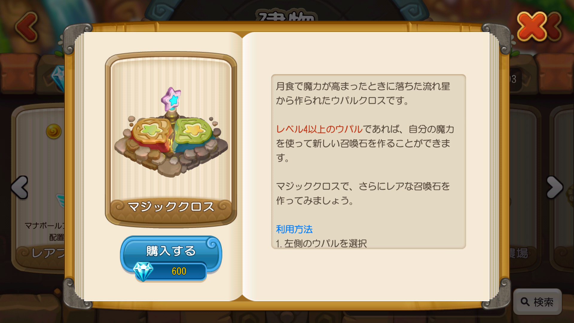 宝石は高価なので、マナボールで買えるウパルだけを買い、クロス(ウパルクロスやマジッククロス)で召喚石を入手する方法がいいと思います。