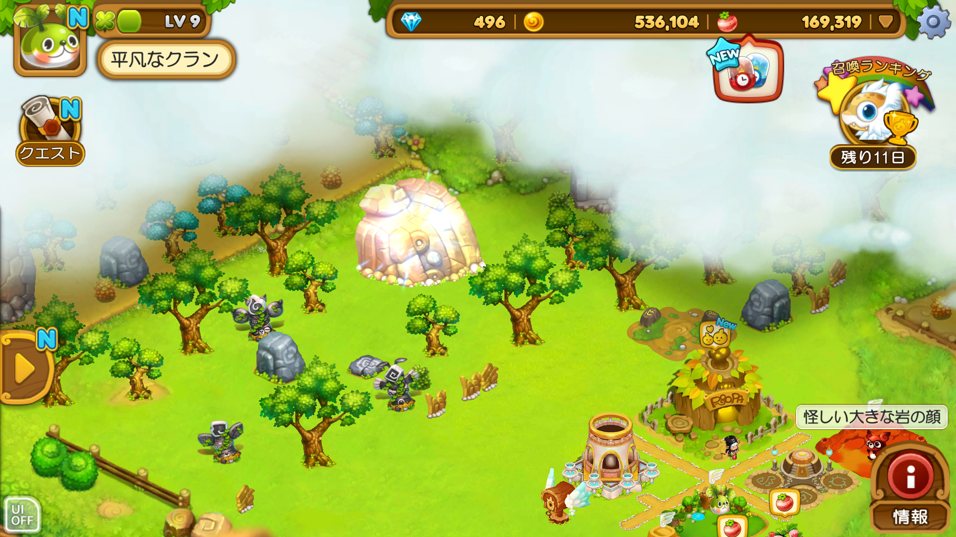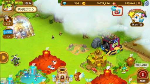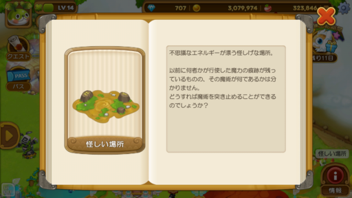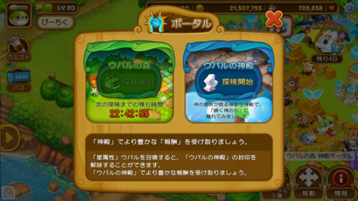 村を「拡張1段階」すると、”怪しい大きな岩の顔”という、光る岩が現れます。それを撤去すると「ウパルの森ポータル」という建物が解放され、同時に ”怪しい場所” が「ルパの壷」となります。
