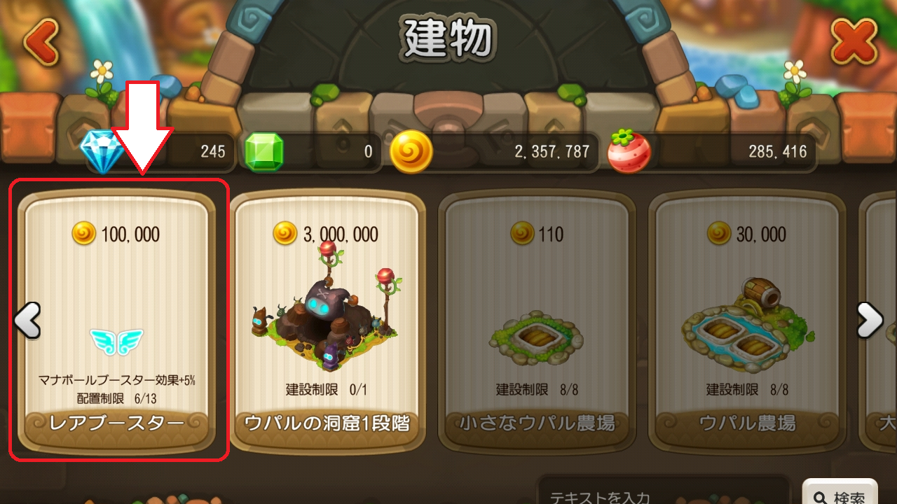 貯蔵量の多い生息地に「レアブースター」の取り付けをオススメします。レアブースターを買える場所は「ショップ → 建物」です。