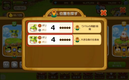 生息地にウパルを住まわせるとマナボールを生産できます。生息地によって貯蔵量(生産上限)や、収容力(ウパルの最大生息数)が違います。