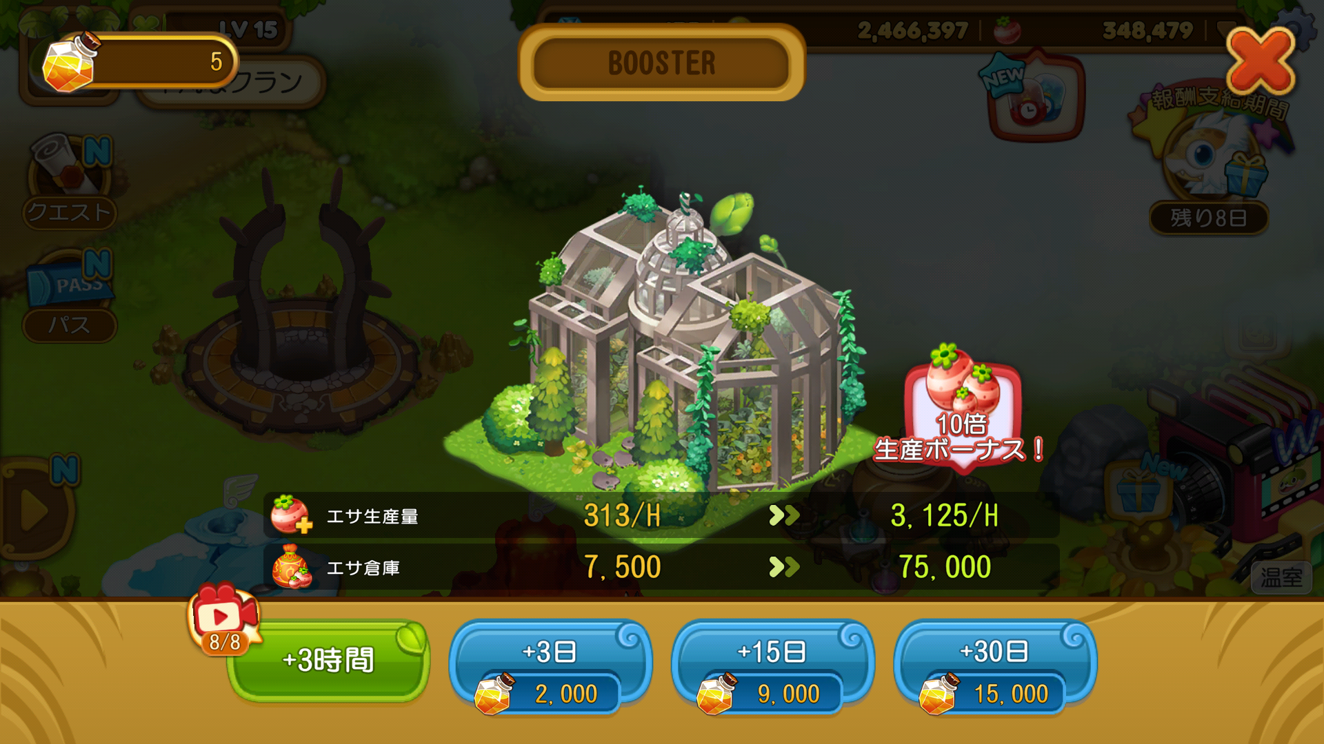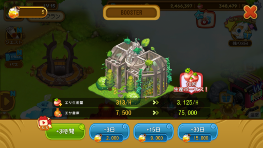 ユーザーレベル15になると建設可能になる建物で、作付けしなくてもエサを生産できます。広告視聴や「ルパのポーション」を使用すれば、生産量と生産上限を10倍に引き上げられます。